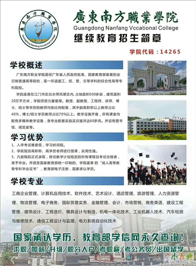 广东南方职业学院是经广东省人民政府批准、国家教育部备案的全日制普通高等院校x_b_a_i_x_i_n_g_c_o_m。办学以来,学校坚持以就业为导向,把人才培养质量放在学校工作的首位,针对广东省特别是珠三角区域经济发展需求和新兴人工智能、智能制造的行业发展趋势,不断调整和优化专业结构,形成了工、经、管、文等学科全面发展的专业布局小+百+姓+网。学院招生代码:14265www.xbaixing.com。